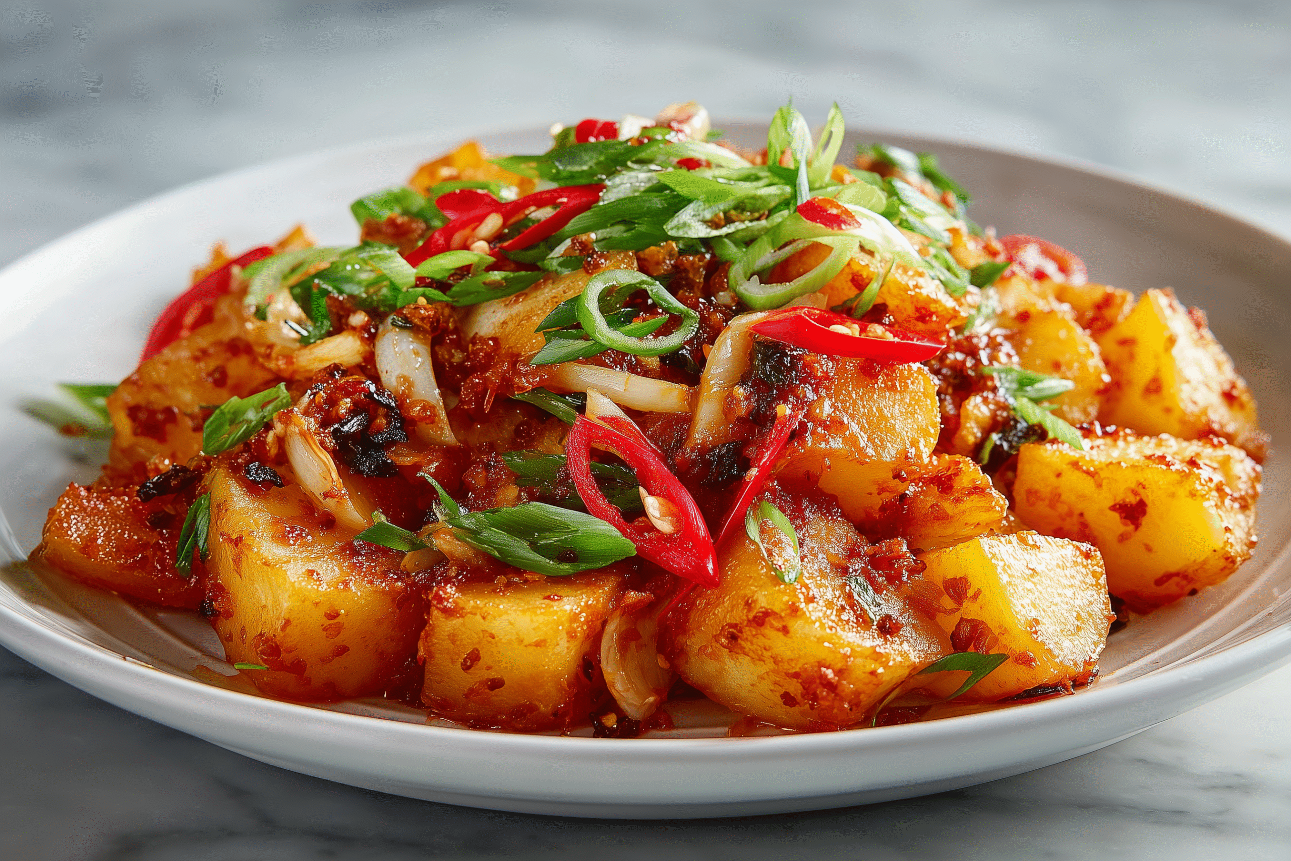 3. Toss in the fried potatoes and mix until evenly coated with the sambal sauce.