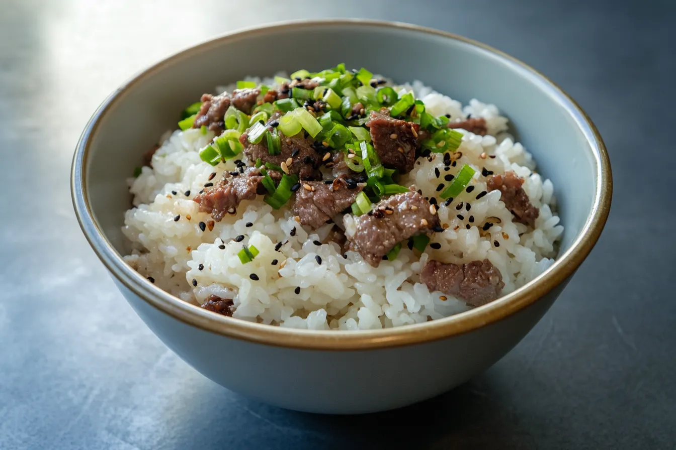 Place the onions and minced garlic over the rice. Top with the marinated beef.